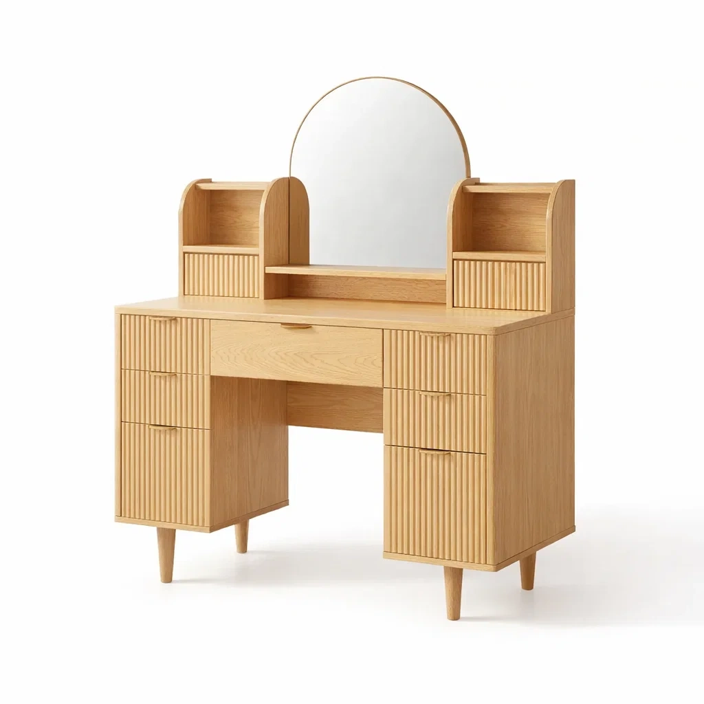 Coiffeuse en bois beige avec miroir rond et tiroirs