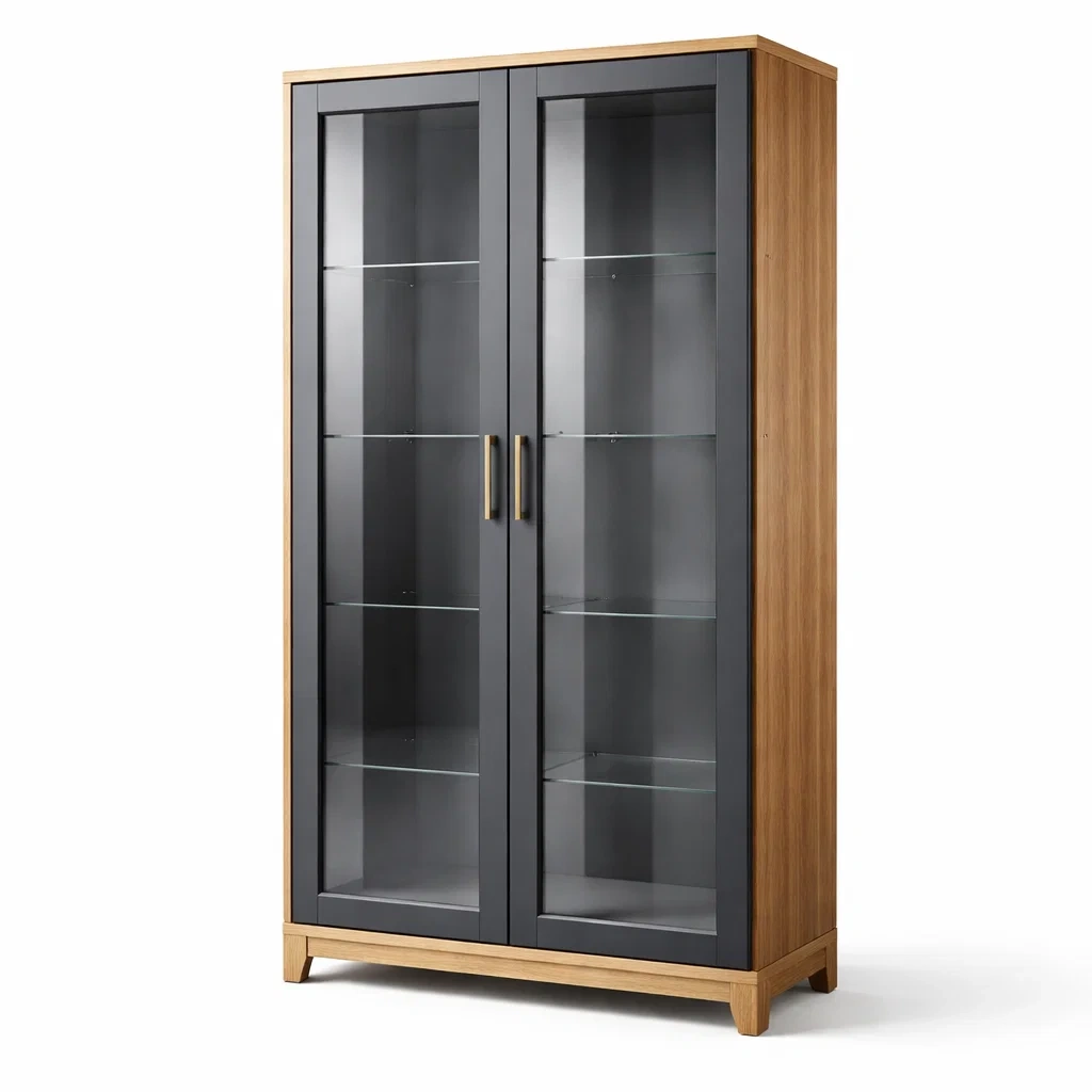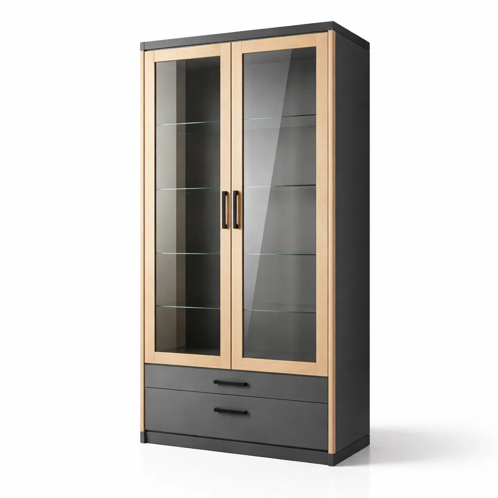 Vitrine en bois et verre trempé gris et chêne 200x90x40 cm