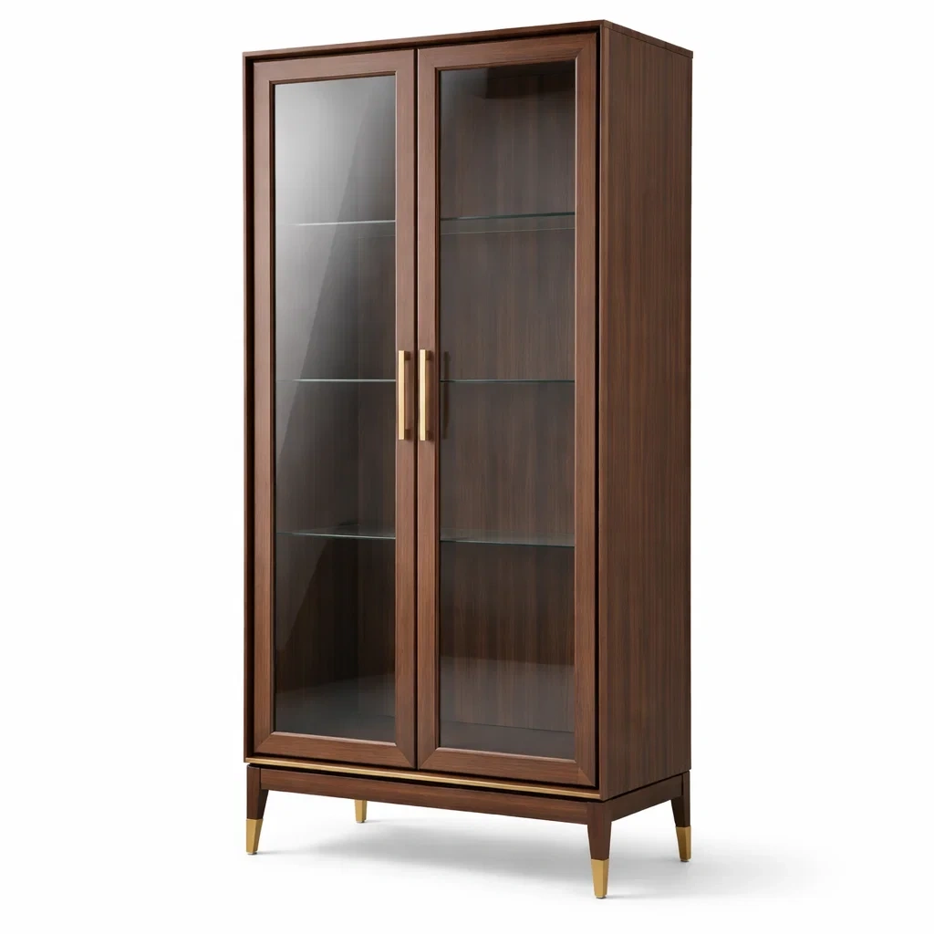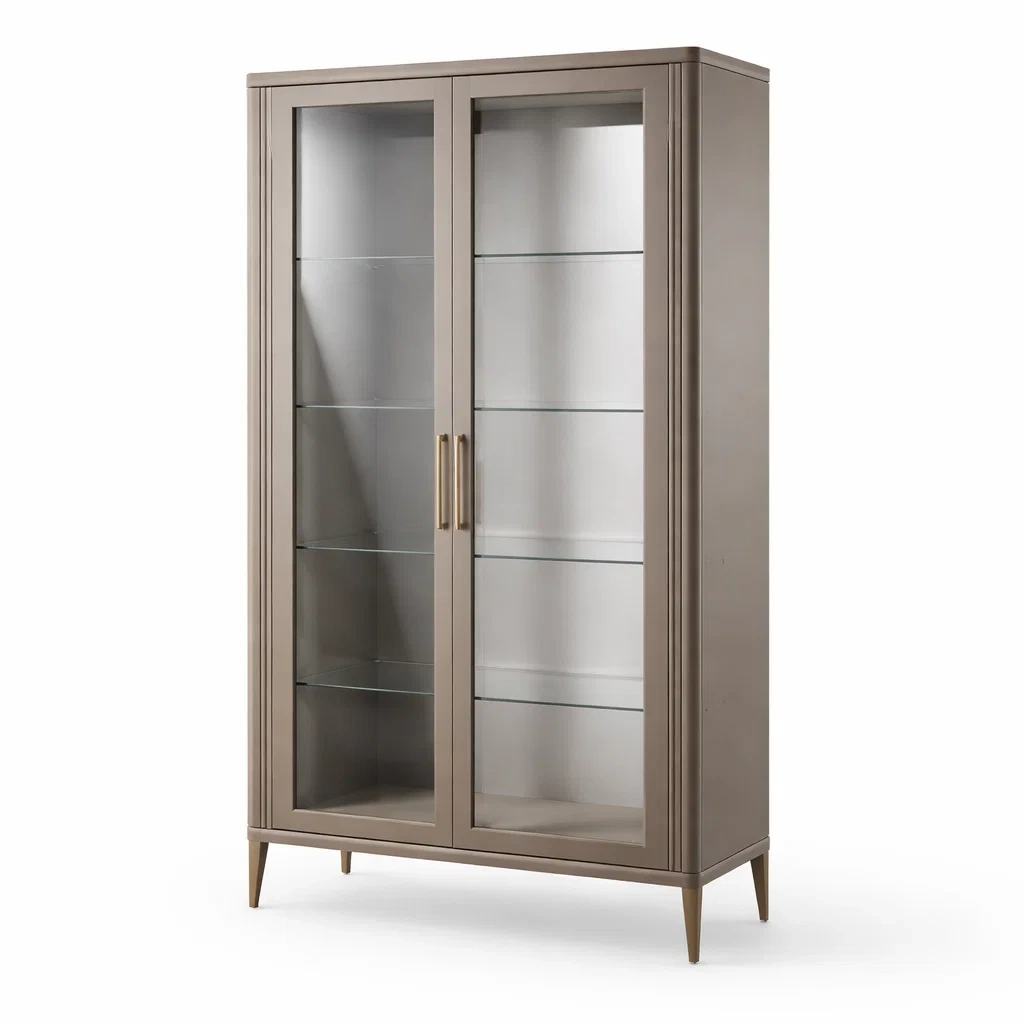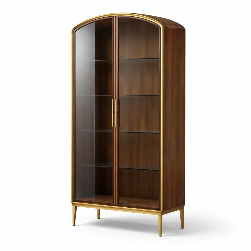 Vitrine en bois et verre trempé avec finition métallique dorée