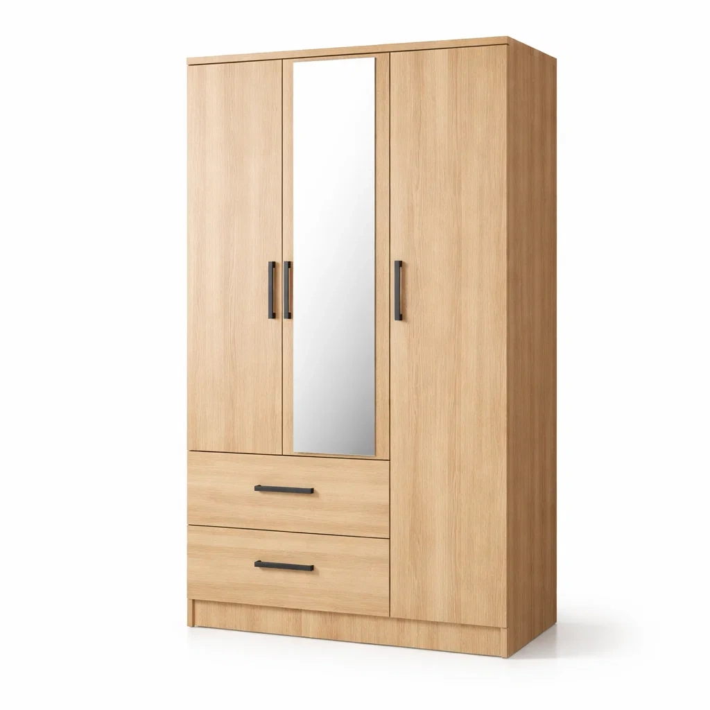 Armoire à trois portes avec une finition en chêne clair. La structure est réalisée en panneaux de particules mélaminés. Les poignées sont en métal, et la porte centrale est équipée d'un miroir en verre trempé. Dimensions : Hauteur 180 cm, Largeur 120 cm, Profondeur 50 cm. L'armoire comprend deux tiroirs et des étagères intérieures.