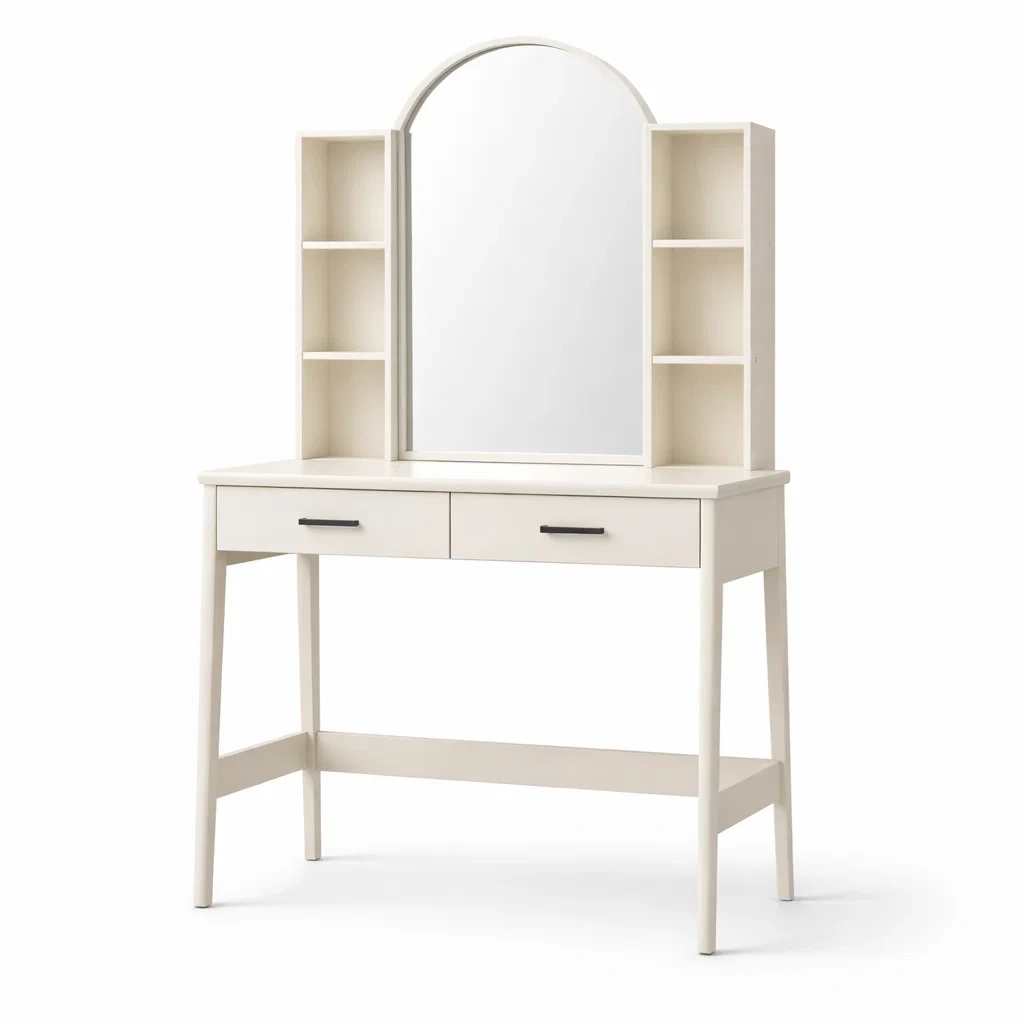 Caractéristiques : miroir arqué, 2 tiroirs, 6 étagères.