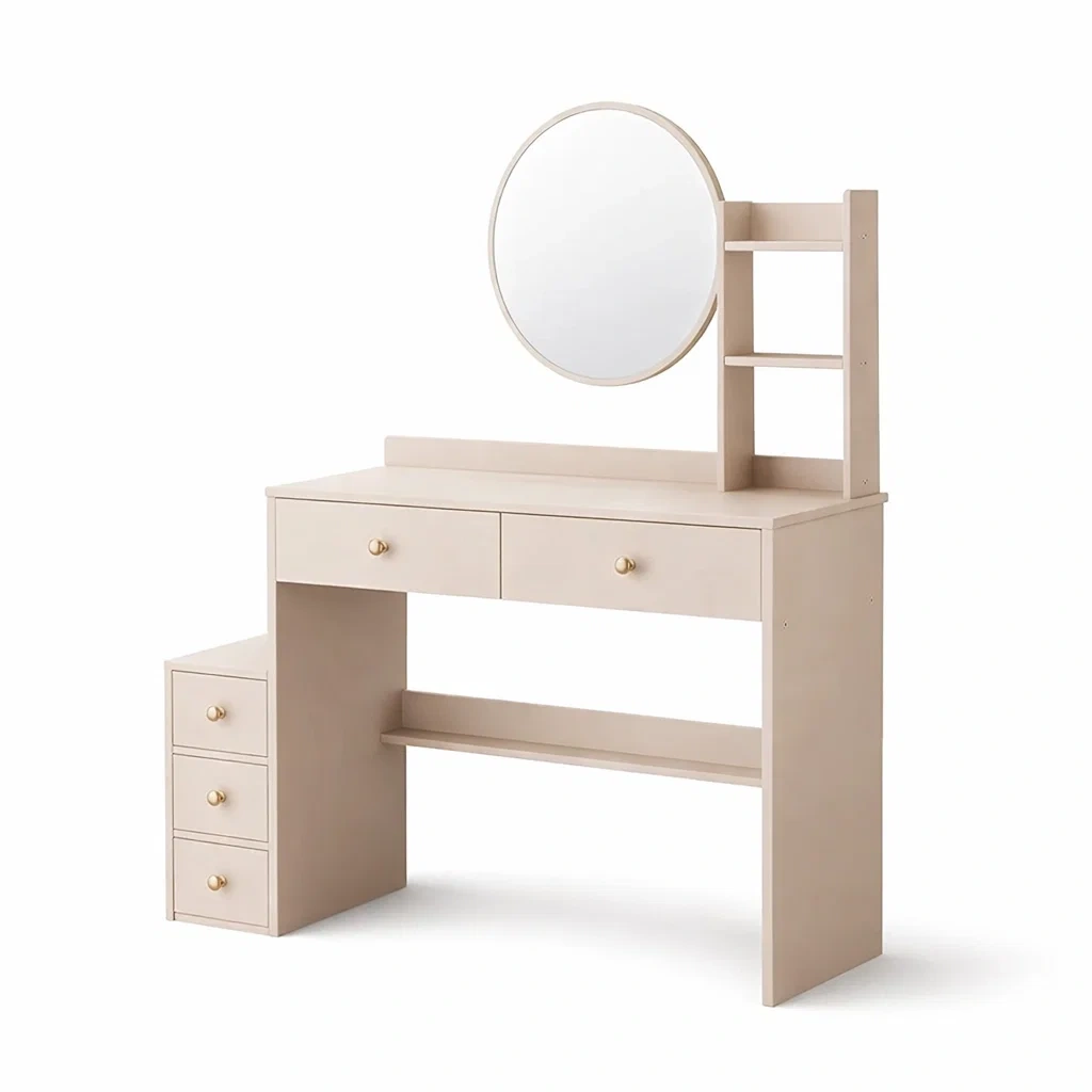 Coiffeuse en bois beige avec miroir rond et tiroirs