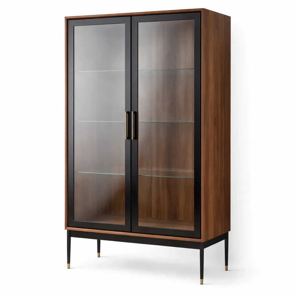Matériaux : structure en bois avec finition noyer, portes en verre trempé de 6 mm, pieds en métal noir.